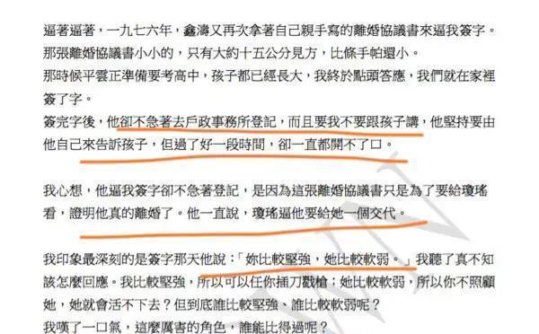 这里有一个细节,就是平鑫涛和前妻林婉珍的离婚大战,在平静中抗争了8年。 最终,林婉珍在离婚协议书上签了字,她决定放这个心早已不在自己身边的负心男人走。 可平鑫涛居然说,离婚都是琼瑶催得紧,他没有办法。